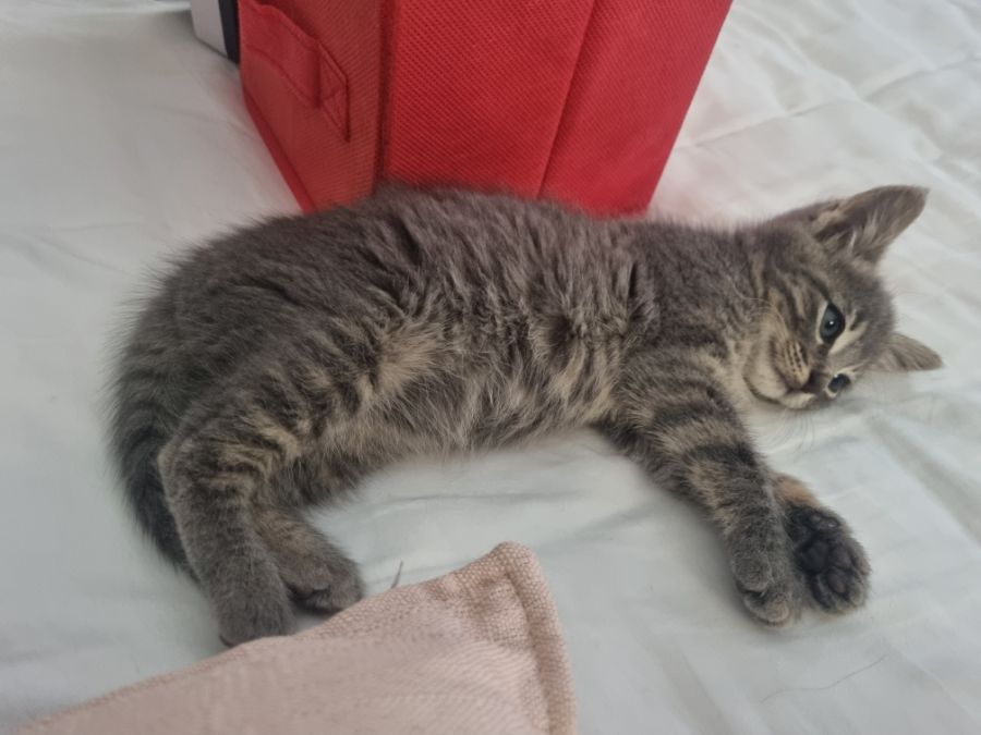 Valerie was born under a house in a new housing estate. Her mum moved all kittens but torrential rain started and she didn’t come back for Valerie. The owners of the house contacted us and were able to get her safe and sound inside with them.