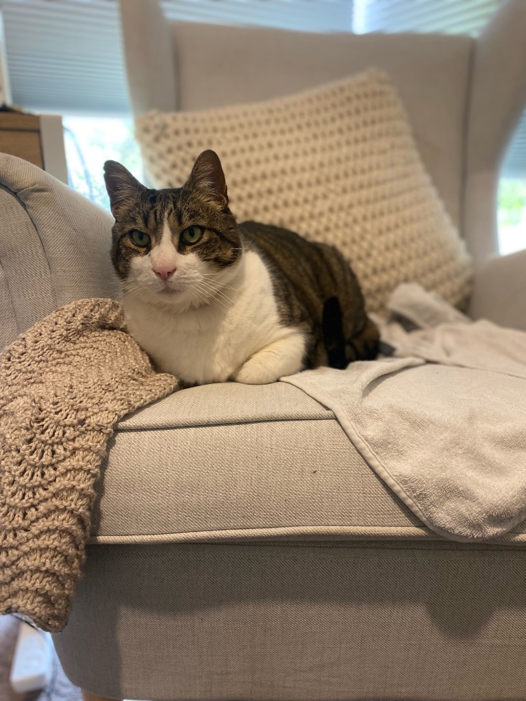 He is described as being gentle and relaxed. A happy 'portly' cat who runs to meet his humans when they come home from work. A big softie (he really is a big cat) who loves to cuddle on the couch and watch tv with you. Shy around strangers he would never pose a threat to you or your guests.