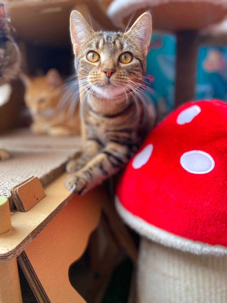 Elmer is a certified sweetheart with charm that will melt your heart. His golden eyes are stunning, and he seems wise beyond her age. He is an active boy who loves to explore his environment before starting a chase with Elsie. Elmer also likes to relax on the windowsill or play cat games on the iPad.