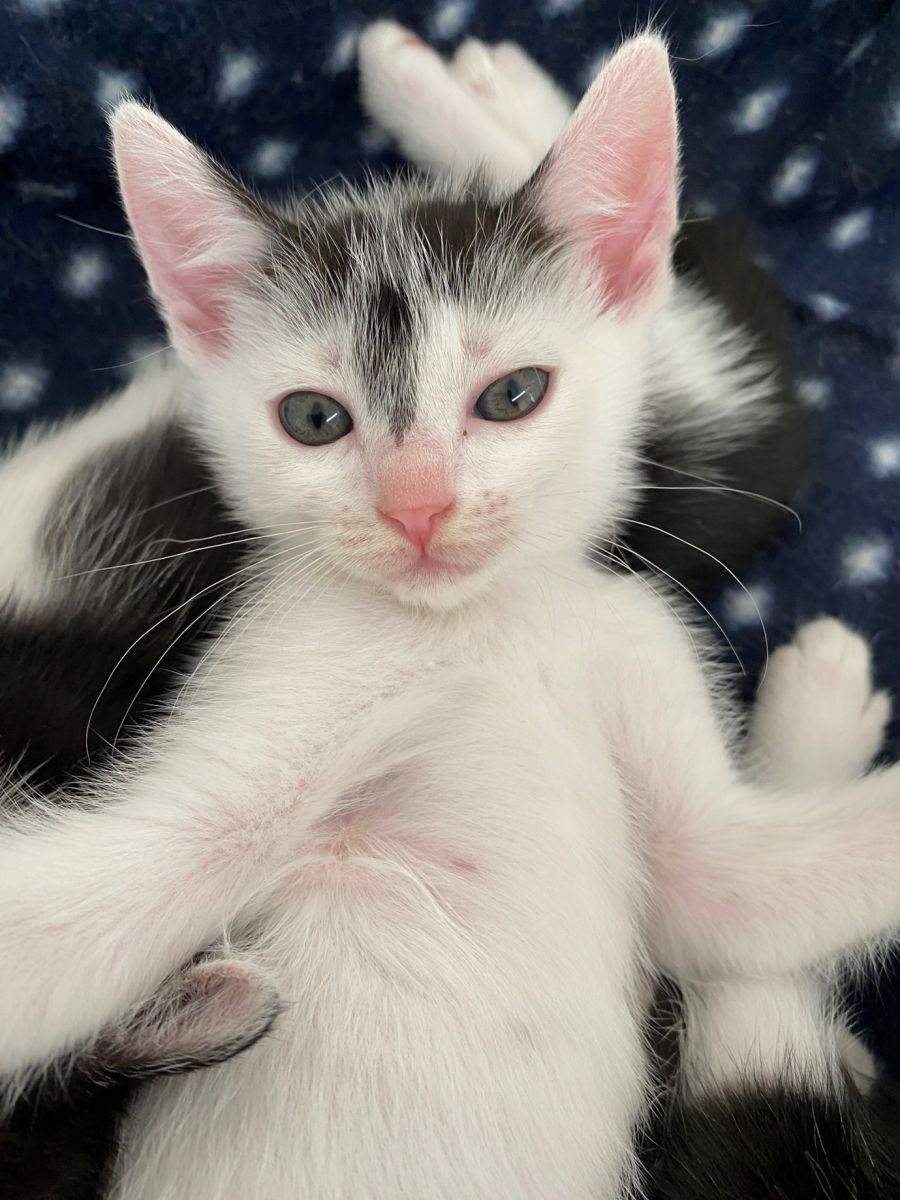Stella is a beautiful black and white female kitten with a distinctive black forehead. As you would expect, she is very active and inquisitive. After a robust play with her brothers and sisters, she settles quickly into a lap nap and is very affectionate.