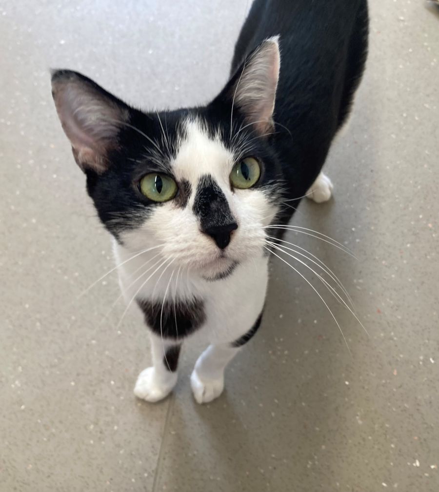 Oreo is a pretty black and white pusscat with distinctive markings and a lovely nature. She is incredibly affectionate and loves people, pats and cuddles. Oreo is best friends with a teenage kitten, Fuzzy, and is often grooming him. While they are not related, they look like they could be brother and sister! She will adapt to a home with other animals and will make a wonderful addition to any household.