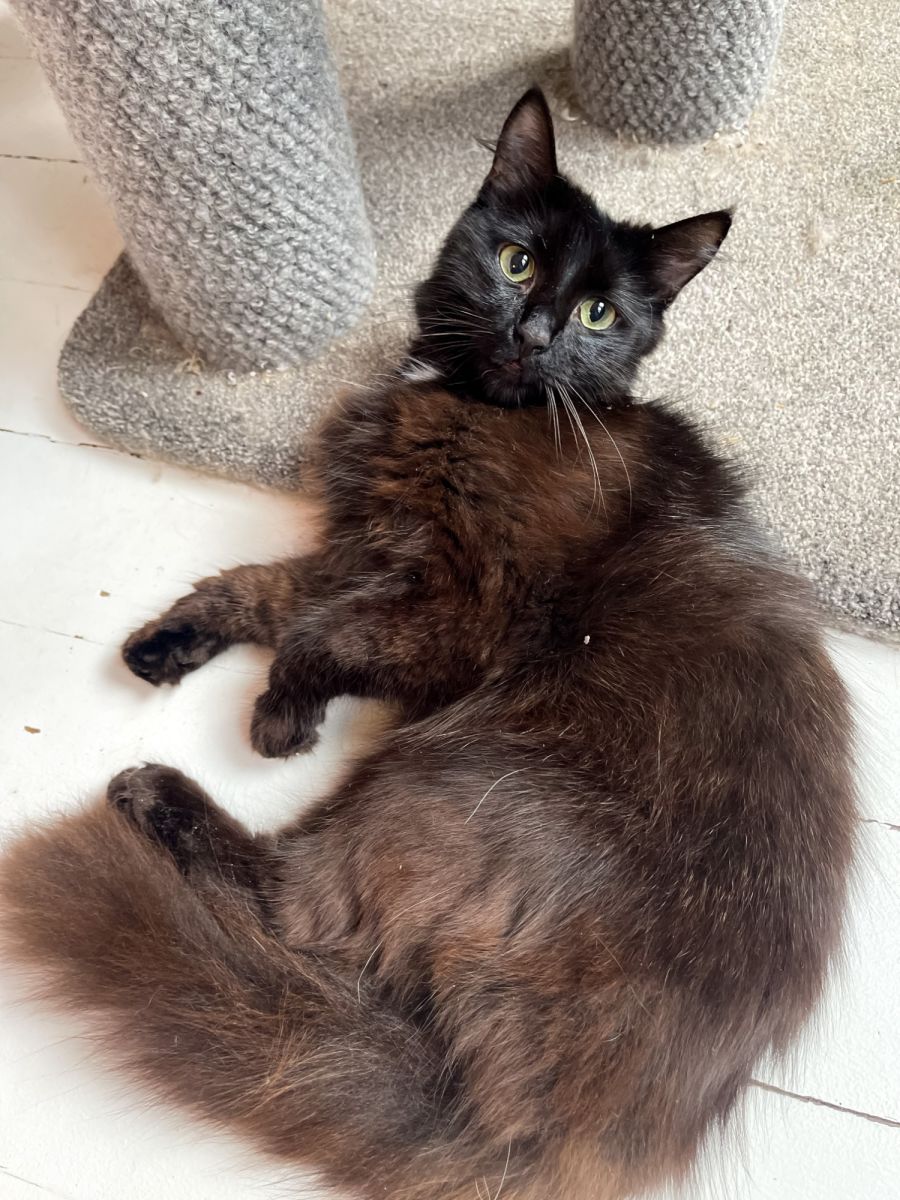 Our gorgeous midnight lady was rescued from a country pound after having given birth in the litter box to her two kittens the day earlier. From the moment she came into the presence of her foster mama, she has been extremely thankful. Always purring, kneading and following her foster mama around. Her two girls are now about to head to their forever home together so it's now time for Sooty to find a forever home of her own.