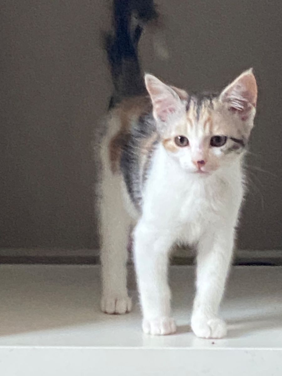 Daisy has a sweet nature who loves playing with her siblings. She follows the boys jumping up on the scratching poles and playing with small toys.