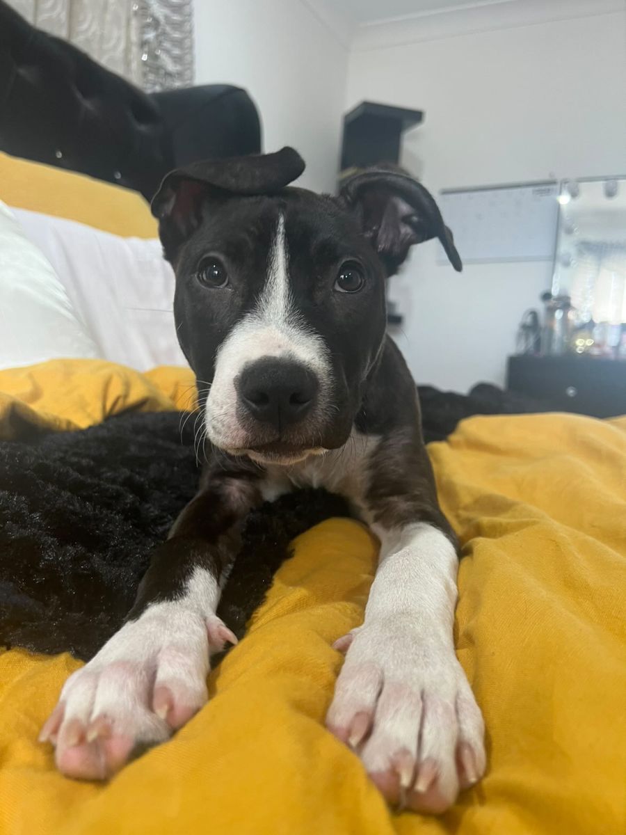 Being an energetic staffy she needs a secure yard with 6ft fencing. She has been crate trained whilst in care and happily sleeps on her dog bed with her doggy foster siblings. Ava sleeps indoors and loves being included with her family.
