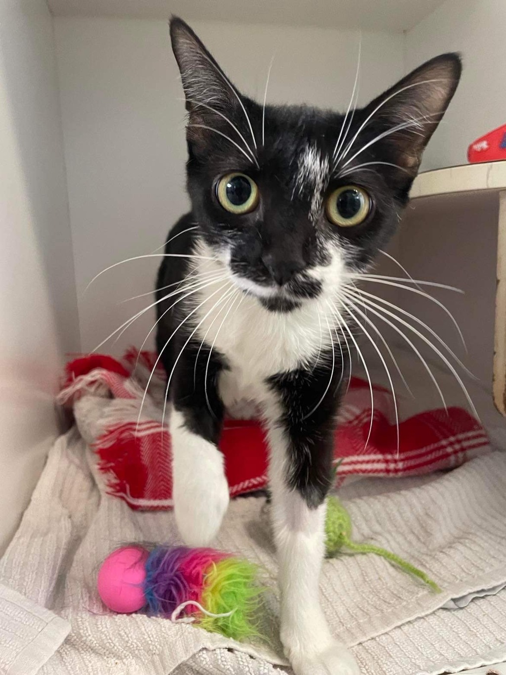Kelly is a delightful young girl. She is full of beans, energetic and very lovely. Her beautiful markings catch your eyes, and her sweet little purrs are just adorable. She has quickly become a staff favourite here at the shelter.