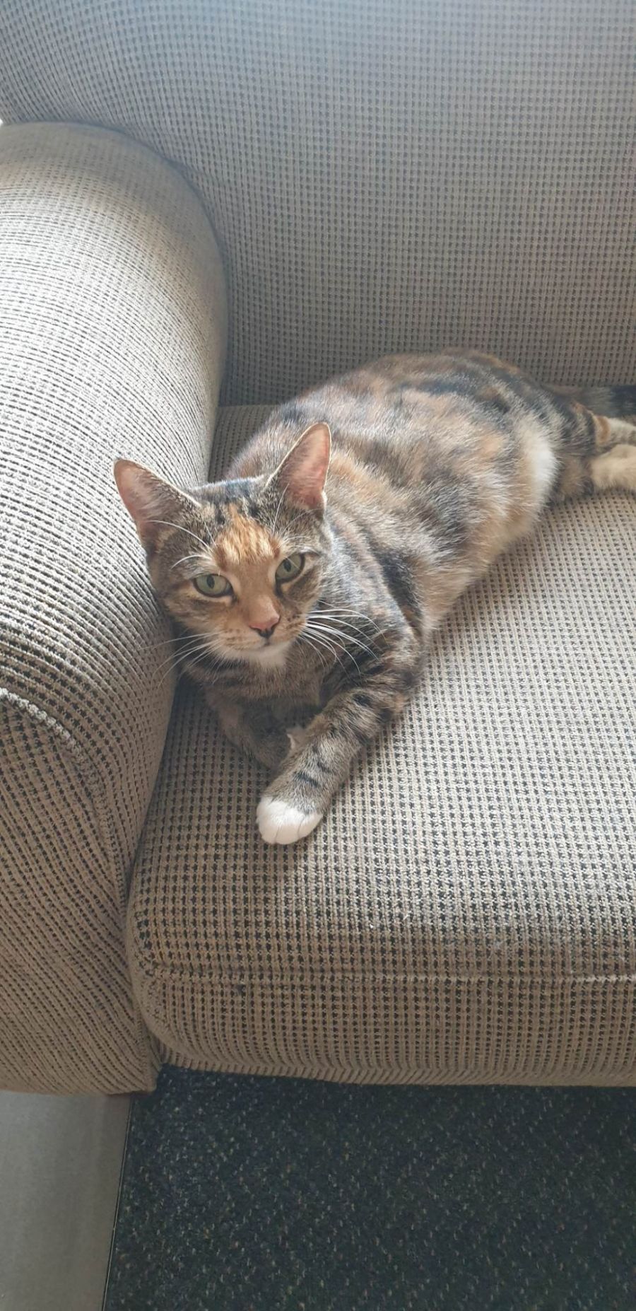 Jaffle prefers to not be a lap cat or be carried around but will happily snuggle up beside you on the couch, laying on the carpet or in bed, her preference is to remain within arms reach for attention.