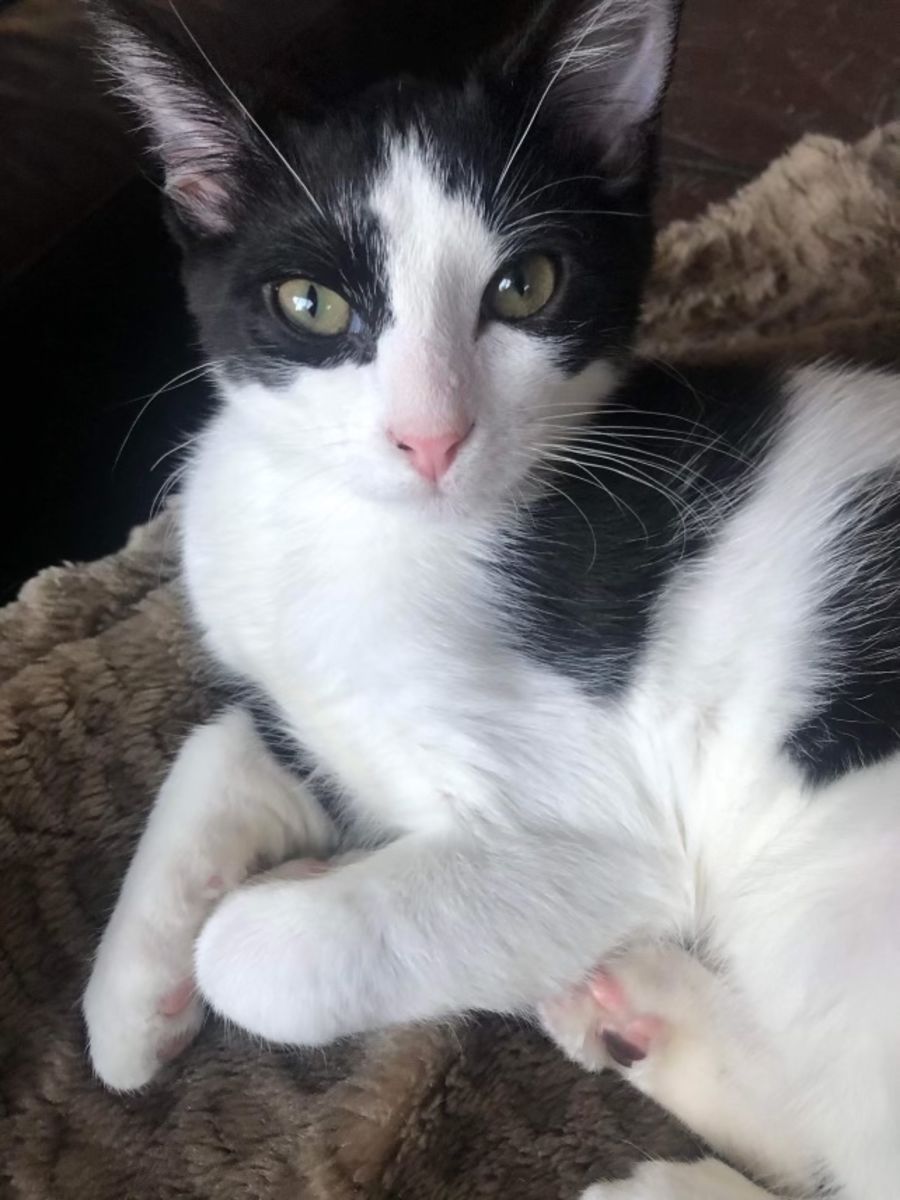 He is 4 months old and would be fine in a home with other cats, but he would also be just as happy on his own.