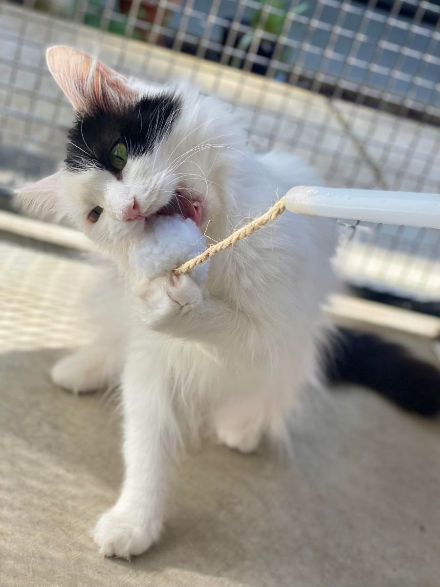 This lady will let you know when she doesn’t think she’s getting enough attention by loudly announcing it. Once she lures you in, she’ll lap up all the attention possible, nuzzling into you and rolling around, and will even gently grab onto your hand to pull it in for more pats.