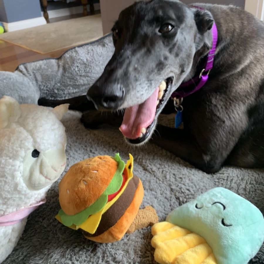 Berni is a delight to foster and acts somewhat younger than other 5 year old greyhounds I've known. She is easy going and friendly and likes her toys - happily throwing a soft toy in the air and then chasing it when it lands. However despite acting younger than her years on occasions and walks, like a true greyhound she enjoys spending most of her time at home snoozing.