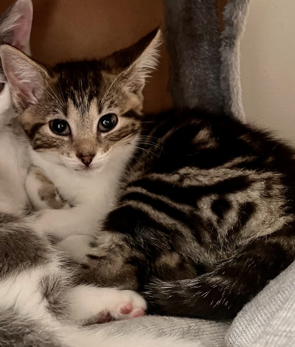 LOTTIE is a sweet natured tabby girl. She loves playing, cuddling and wrestling with her sister Luna. She's a happy little kitten who is quite talkative and likes to spend her days exploring, eating and napping.