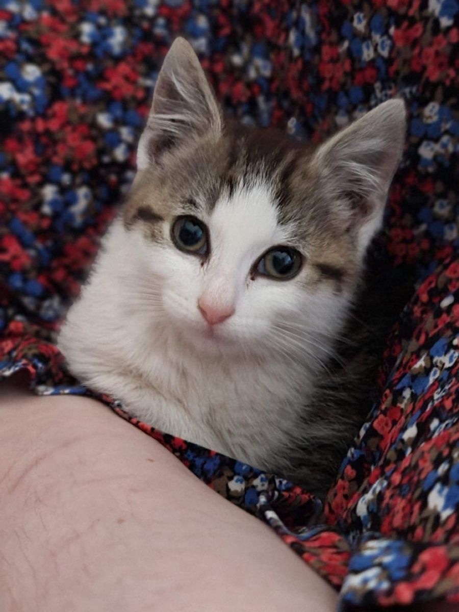 She’s a friendly little kitten who would enjoy a home with a fur friend so she can snuggle but will be equally happy snuggling you.