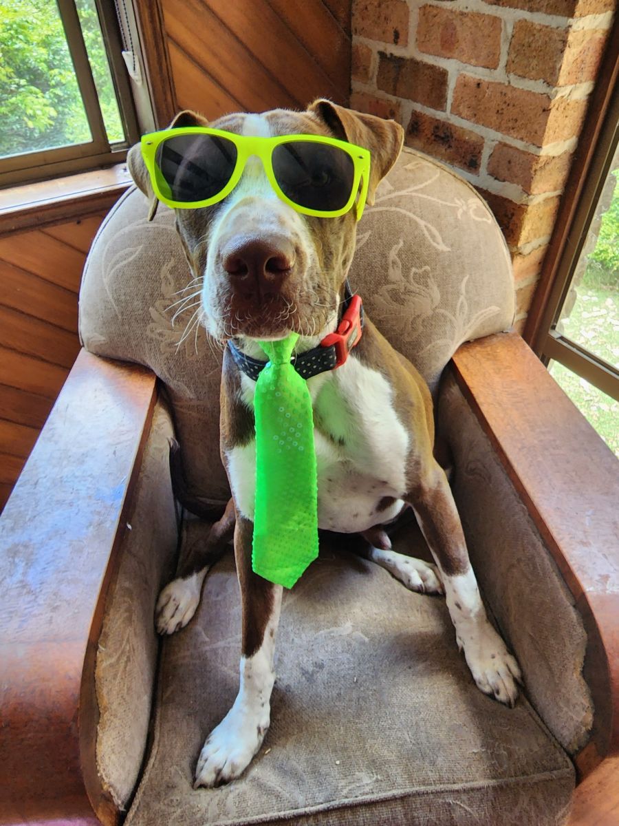 Hi, my name is Benny. I am 9mths old and a cute Staffy x . My foster mum says I will be a large medium. I love to fress up in fancy clothes. My Forster mum said I have really long legs and will soon learn to run properly. I am with 8 host dogs who I love. I do zooming with the cattle dog and kelpies. They are my best friends. My foster mum calls me her cute gentle crazy boy. She says I don't have a mean bone in my body. I love kisses and cuddles and playing with other dogs. I love to run and go for walks. My foster mum says I need a family that goes out and will take me with them because I love adventures. I will love my family forever and ever.