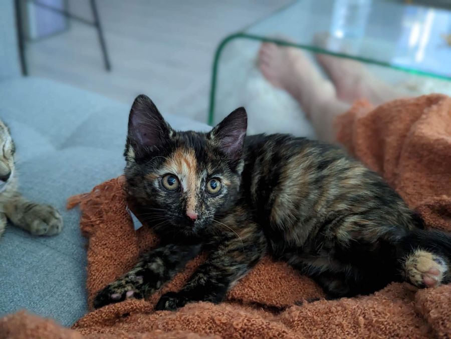 Pinky is a 16 week old female Tortoiseshell Domestic Short Hair Kitten who loves to explore and play! She is a very high energy kitten that loves playing with her crab toy, cat tunnel or even a paddle pop stick, and can entertain herself for hours! When she's done playing, Pinky will come find you for some cuddles - she knows how to make her presence known with her loud purrs! She is a social kitty that loves to be around people. When she’s not playing she likes to enjoy her time sitting on a warm windowsill in the sun :)