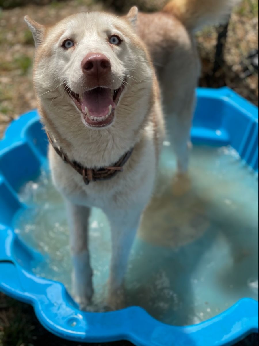 She loves to play in water, and you will often find her trying to sit in her water bowl. She walks well on lead, but she does pull on the lead. Like your typical husky dog, she is very vocal when she's left alone.