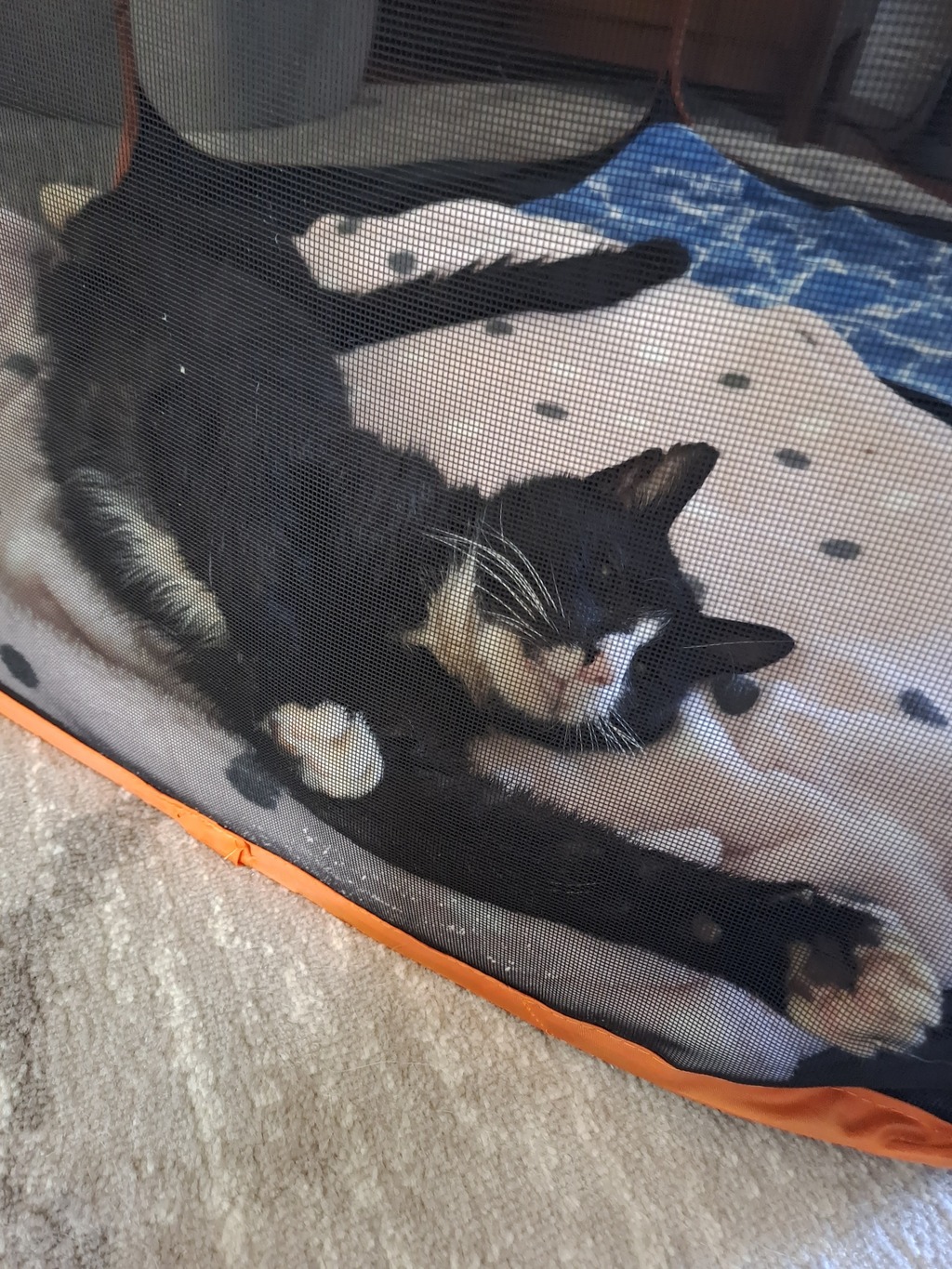 After being on the streets and having to defend himself, Eeyore has contacted FIV, which affects a cat's immune system. He will need to be in an indoor only home, where he is either the only cat or with a cat that's sociable with FIV already. He could also live with any feline that has been vaccinated against FIV.