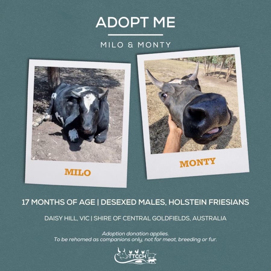 Milo and Monty were saved by ‘Til The Cows Come Home from a dairy farm and rehomed into a loving family at 7 weeks old where they lived happily amongst alpacas, dogs, horses, sheep and cows.