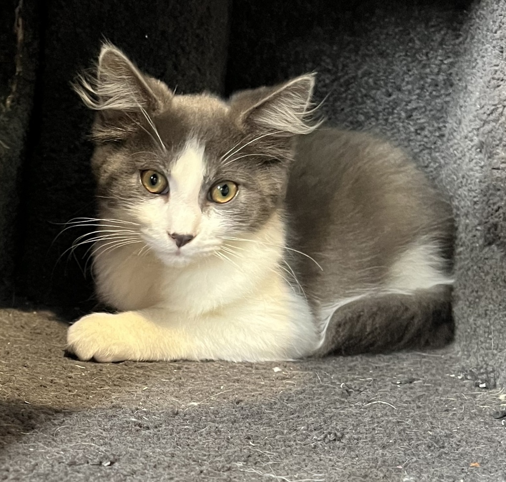 Ian is a sweet little boy who enjoys the company of other cats. He is an adventurous climber so he would love a high perching spot or cat tower to scale.