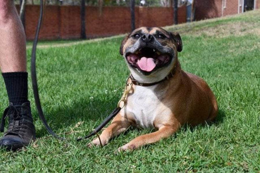 Hi, my name is Tassie and I’m an 8-year-old playful English Staffy on the chunkier side. Unfortunately, my previous owner has gone into a nursing facility and I’m on the hunt for a new family home. My big head matches my big heart. There’s nothing in this world that makes me happier than being amongst my people. I am a breeze to walk on a lead and will follow your directions (I don’t even pull when I see another dog). I’m friendly with dogs, usually, I’ll go up and sniff and keep going. I love my toys (although they might not last long after a session with me) and when I’m left alone, I might act sooky for the first ten minutes, and then I’ll sleep the rest of the time. I am definitely an inside dog (and toilet trained) and will firmly be part of your family environment. There’s not much I don’t like – in fact the only thing I don’t like is the dreaded vacuum cleaner. I’m good with kids, I’m a cuddler, and just love a good play. Let me know if I’m the big boy for you, I’ll show you all the love and more.