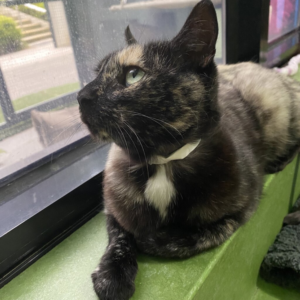 Patch is a friendly girl who loves to say hello! Patch needs to be kept indoors as she is FIV+. As long as you have plenty of things to entertain her indoors, she will be happy chilling inside with you. She enjoys snoozing by a sunny window. She will greet you with a meow when you get home and is very smoochy. Patch has an unknown history so we are unsure if she is suitable to go with younger children-come in and meet her and see if you are her new family!