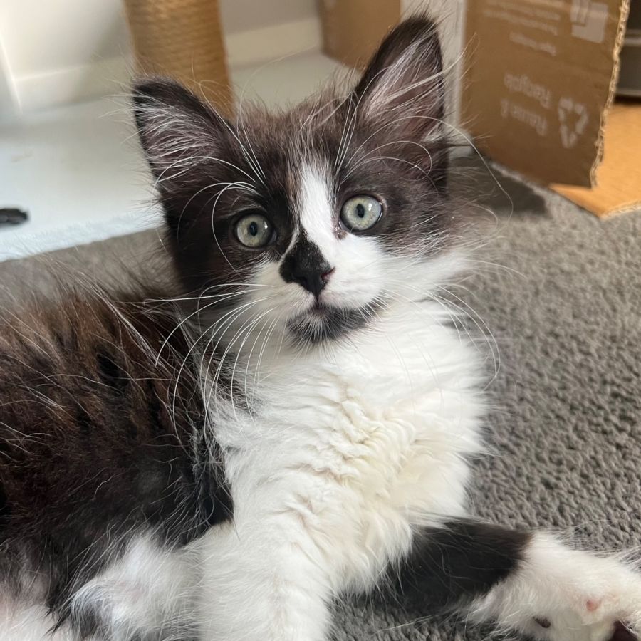 Hi there….my name is Elsie and I’m a 9 week old DLH (Domestic Long Hair) girl and super cute! My coat is chocolate and white, but do have some darker fur underneath, so this may change as I grow up.