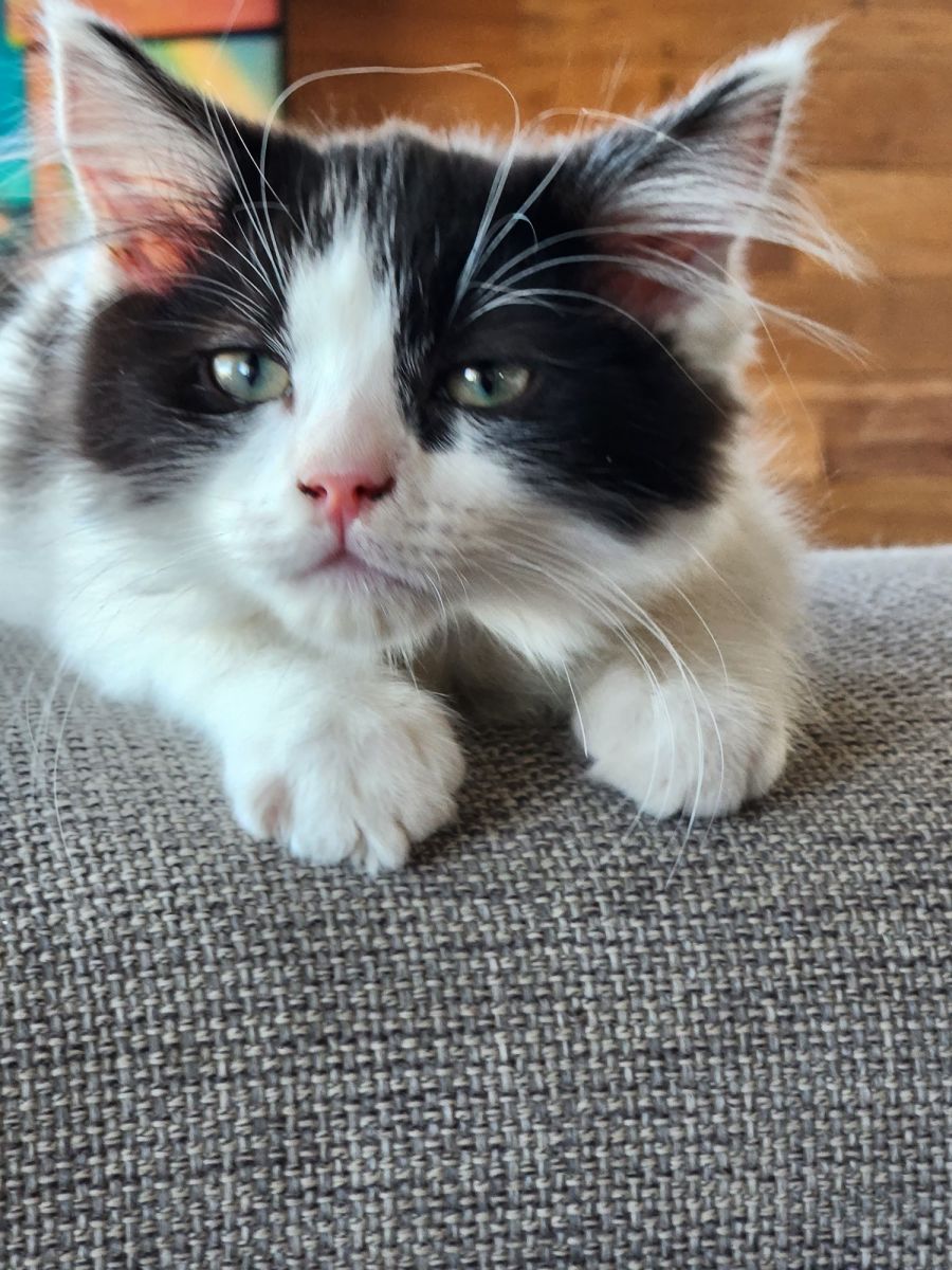 Oreo is a playful cheeky 9 week old kitten. He has 2 German shepherds as big brother and sister that play respectully with him. He loves to fall asleep watching TV and does like a cuddle but is very playful. Great with kids. Indoor only