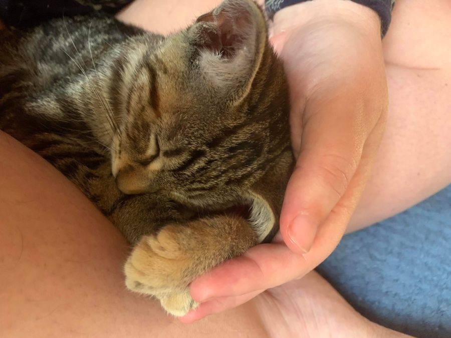 Sue enjoys cuddling. She is a very affectionate kitten and loves to snuggle up to her people and siblings to have a snooze.