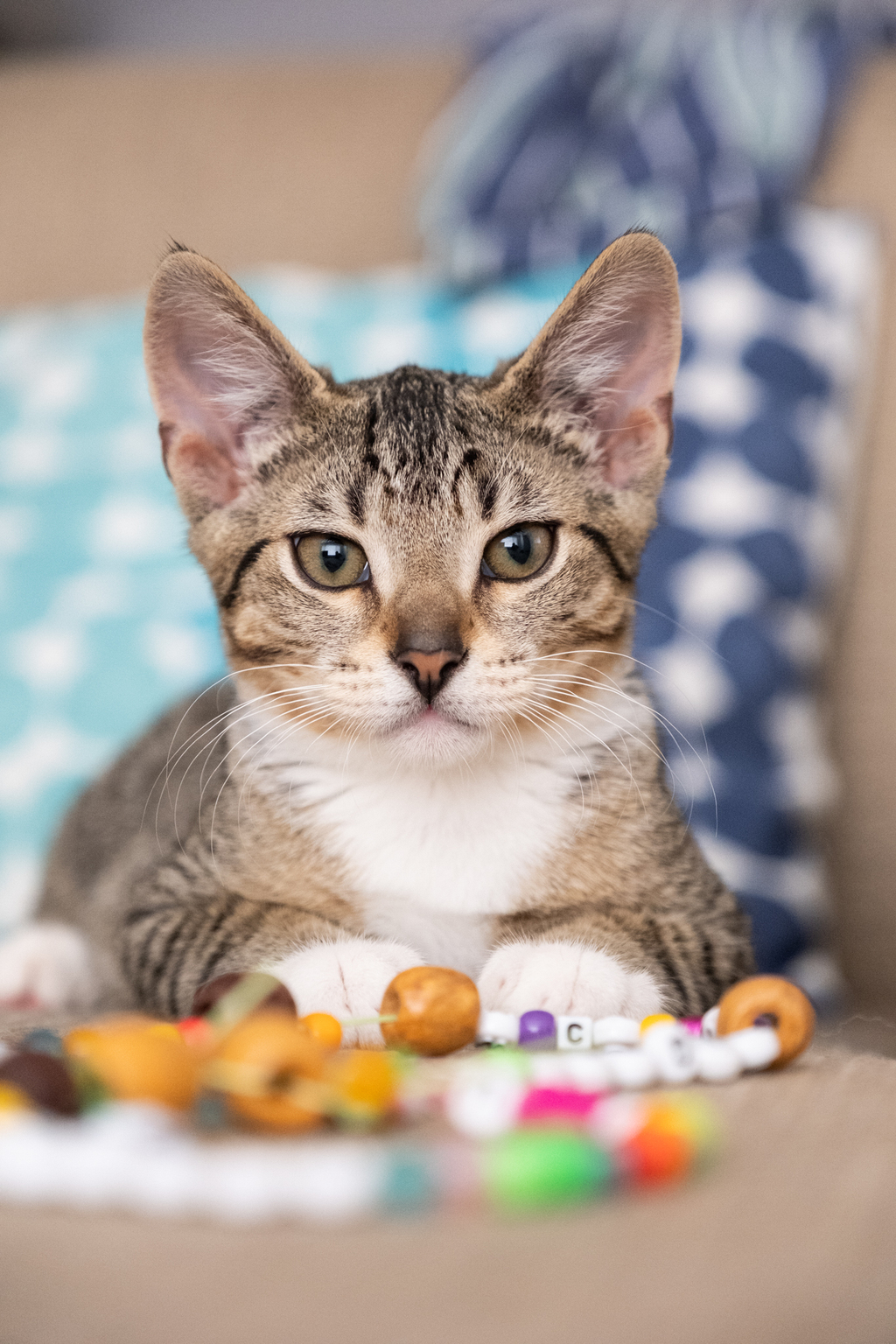 If you're looking for a sweet, mellow and super dooper handsome kitten, look no further! Vinnie is a very happy and cuddly kitten with a big heart. He is very good at being independent, and is perfectly happy entertaining himself for hours. He will play with anything he finds lying around the house - who needs toys when you have the moving people on the TV to chase?! He also likes to watch you as you go about your day, and he particularly enjoys sitting on the bathroom sink and having a lovely chat! He's just an ideal little life companion.