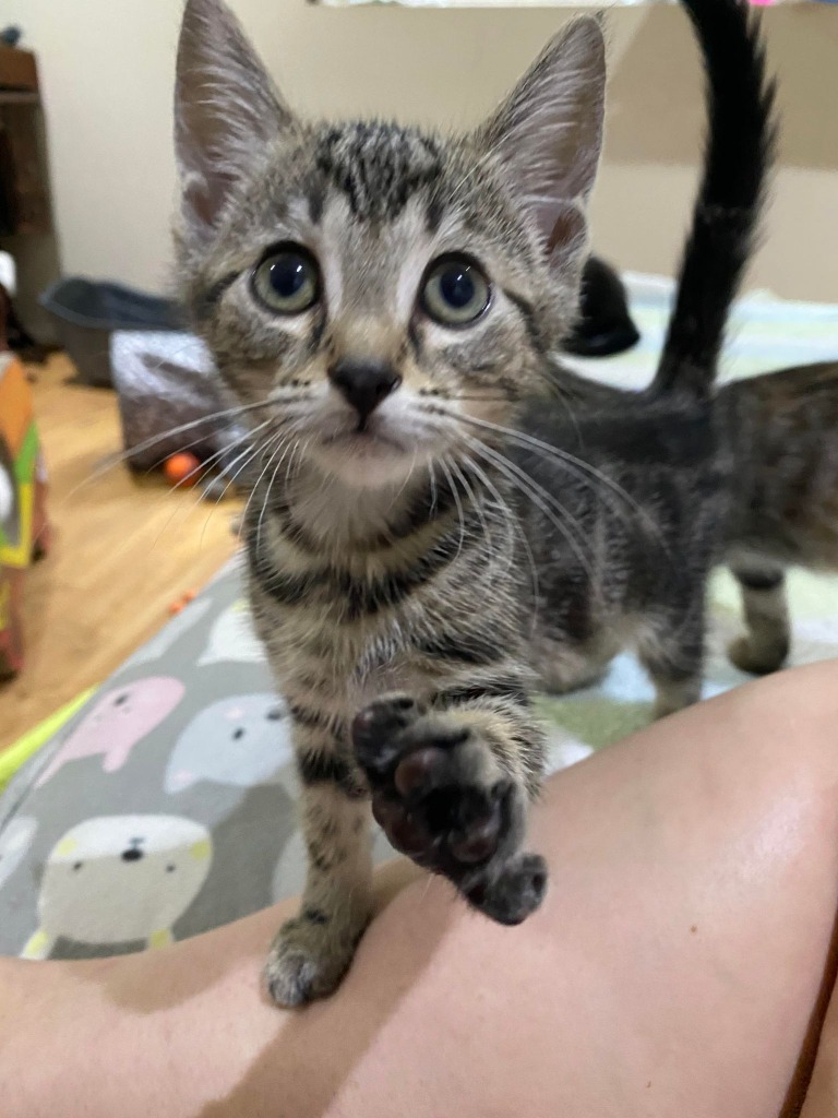 Most often he can be found cuddling up to his people, purring and making biscuits after the kitten crazies are over. He loves wrestling with his brother and playing with the wiggly string and his crinkly ball. Hopper is good with other cats and loves to cuddle up and be groomed by his older foster cat siblings. He would fit in to any sort of household, especially one where he got lots of attention (including a house with gentle kids to entertain him, and another friendly cat to love him as well). Hopper Is untested with dogs but would be ok with the right introduction to a resident, cat-friendly dog.