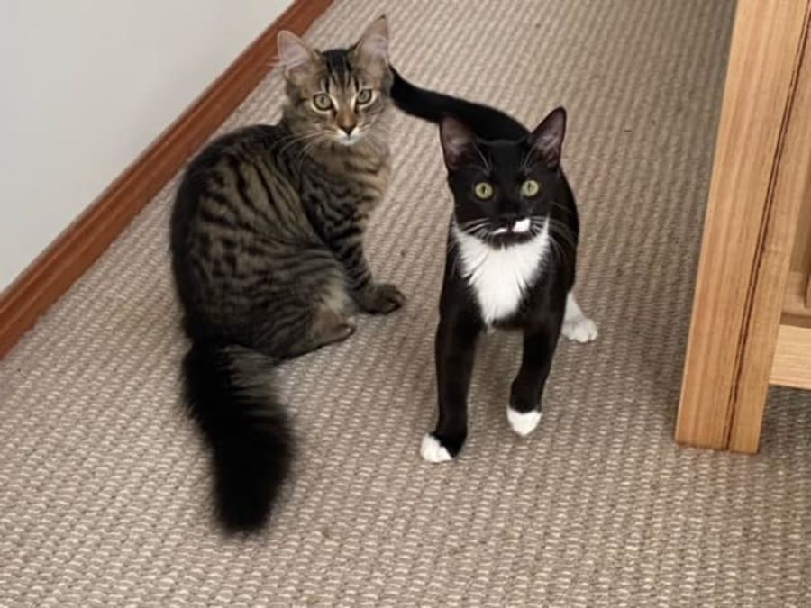 Simba (medium hair tabby) is her playful and outgoing buddy, who loves to play and cuddle.
