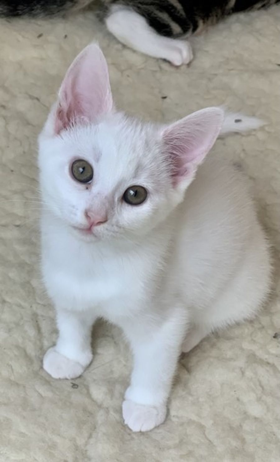 This gorgeous girl is deaf and does have some special needs in terms of her care. Due to her not being able to hear threats such as cars, dogs etc (as well as her light colouring) she needs to be kept indoors only. People would need to be conscious of not sneaking up on her.