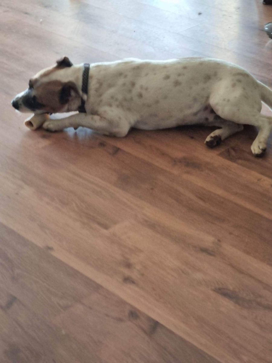 She is so sweet and gentle. Just loves to be inside but happy outside. Great with other dogs and happy to play with them but just as happy on her own. Inside she is happy to chill and lie on her belly. Or gets lots of cuddles. She does sleep in a crate at night and is crate trained.. she has shown no signs of agression, doesnt dig and doesnt jump.
