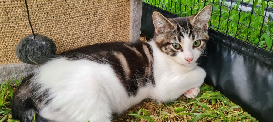 Chuck is a super chilled little man who would lay with you all day lapping up pats and cuddles and purring his little heart out. He doesn't play very much and when the other kittens are playing he can be found snoozing in the corner. If you are looking for a lap cat to keep you company Chuck is your man.