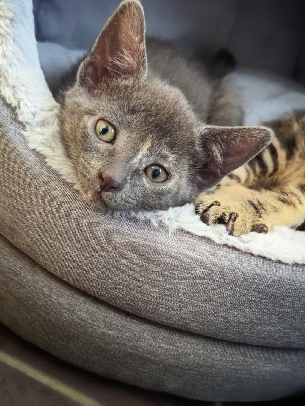 She is mostly Grey but has adorable flecks of ginger from her mum. Including the tip of her tail.