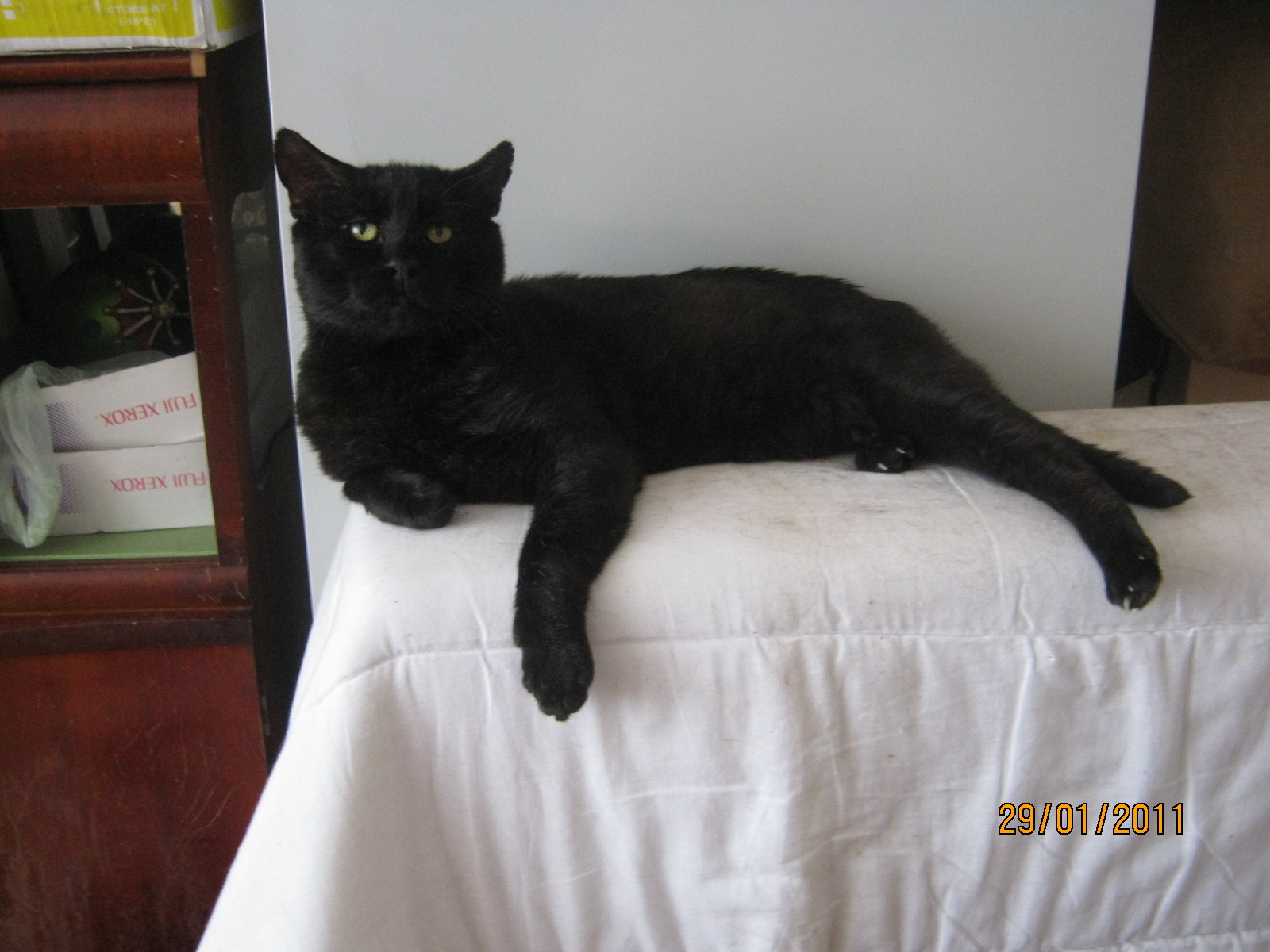 lived with an elderly woman until she had to move and was unable to take him. Probably not used to small children. Loves a lap,is affectionate and likes to pat ankles as you walk past him!
