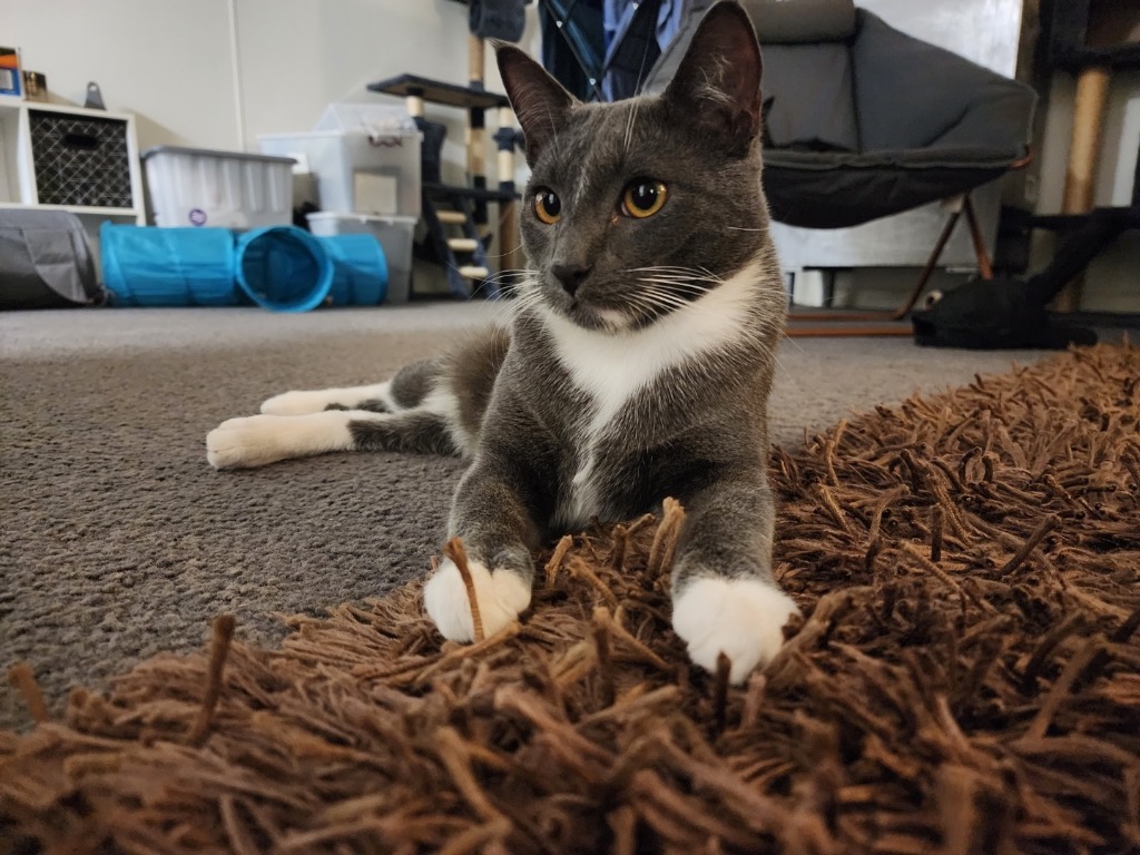 Azure is in care with foster kitten Coco and having kitten companionship has helped Azure to come out of his shell whilst living the dream with free food, pats and Aircon - his carer he said he likes pats - and is a bit of a smooch - he will need time to warm up to his new family and allow him to come to them. He would suit a home with a friendly feline looking for company.