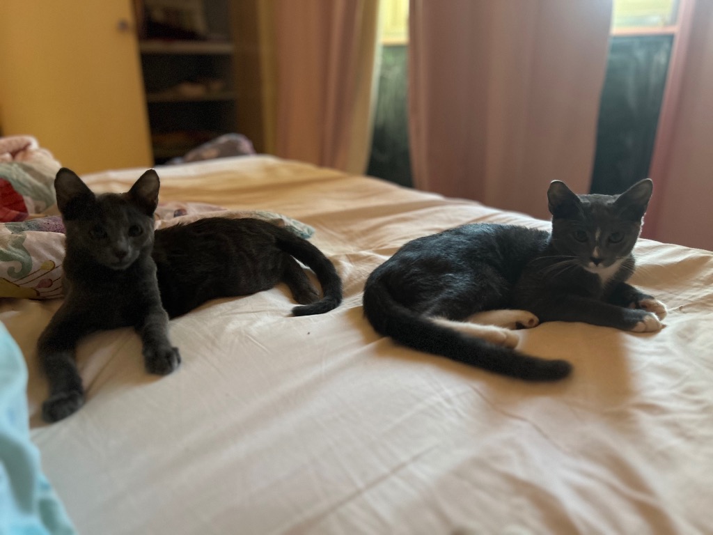 Remember Gandalf the Grey? Well meet his sisters - Suede and Dusty. In foster care together and with small children - they are thriving and adjusting very well to domestic bliss, the free food, toys and human beds!!! These brothers are thick as thieves and we are looking for a home that may be looking for 2 bonded gals.