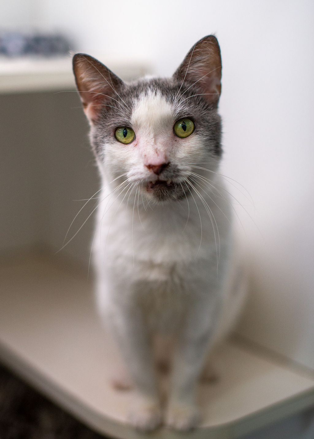While she might look a bit funny due to her previous medical issues, she is such a sweet and loving cat that always will seek out her persons love and affection.