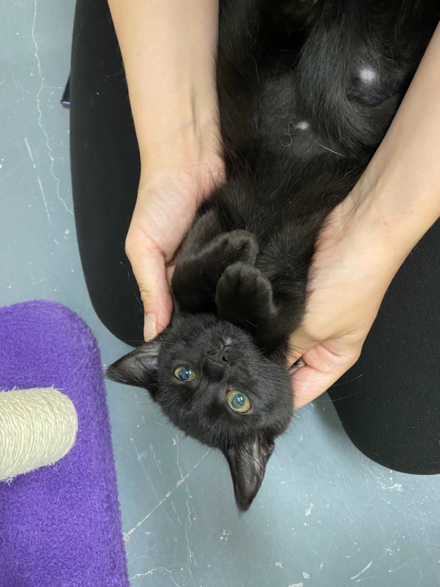 Obsidian is a female kitten who loves the attention of people and other animals. She is endlessly curious and has an adventurous spirit, often trying to climb and watch the world from up high. Despite being a little clumsy, she is determined and playful, proving that black cats are just as lucky as any other type!