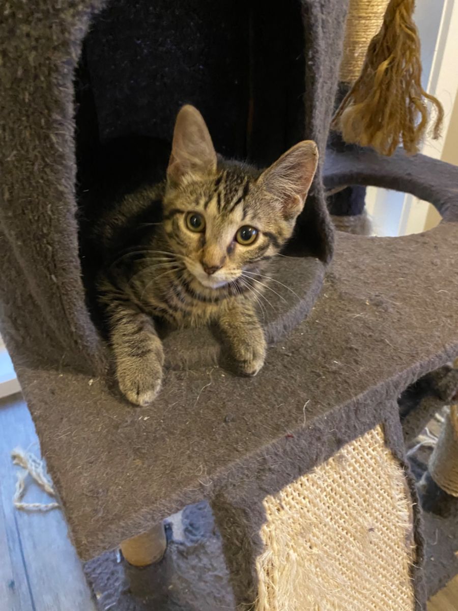 Oliver and his sister were found near their deceased mumma in a factory. They were lovingly raised by one of the workers family and had a large dog and cat who looked after them. They then transferred to Meow Rescue to be desexed and vaccinated and put up for adoption. Oliver loves hanging around with his sister and other kittens so would do well with another cat. He loves chasing toys the ball tower and the red dot around. He is a little shy at first but loves cuddles and has a loud purr.