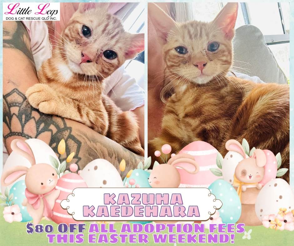 HI! I'm Kazuha , and I am a true little warrior! I joined little legs at only 4 weeks old as a very sick little boy. My Brother and Sister and I had a very rough start to life. We came into care on deaths door, starving and severely underweight. Unfortunately we had severe catflu, I couldn't breathe out of my nose and my chest was crackly. My eyes were so very sore and I had very limited sight. We received urgent critical care and despite a few setbacks pulled through! I was the luckiest of the three of us, and being the biggest and strongest I pulled through very quickly once I received proper care. I love nothing better than to play and play and play! I absolutely love playing with my siblings, toys or anything I can find! I also am an affectionate little guy and love to come and sleep on you when I am done playing. I would love to be adopted with my little Sister Raiden or little brother Kaeya , as we all have had the same strain of catflu there is no fear of us infecting each other and we already love each other very much. I am the most confident of my litter , very eager to explore and meet everyone. I absolutely adore the big cats and would love to make friends with any cat I can! I would also be happy with a gentle and friendly doggie buddy.,