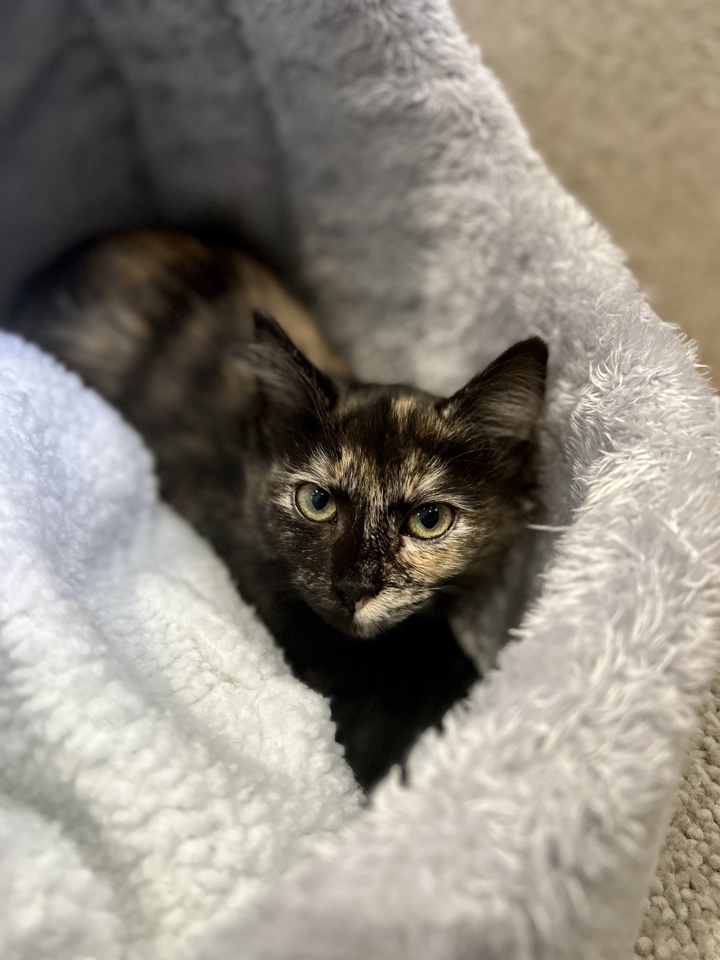 Bow would do well in a home that has another friendly cat or kitten in the home. She is energetic, playful but really enjoys her down time too.