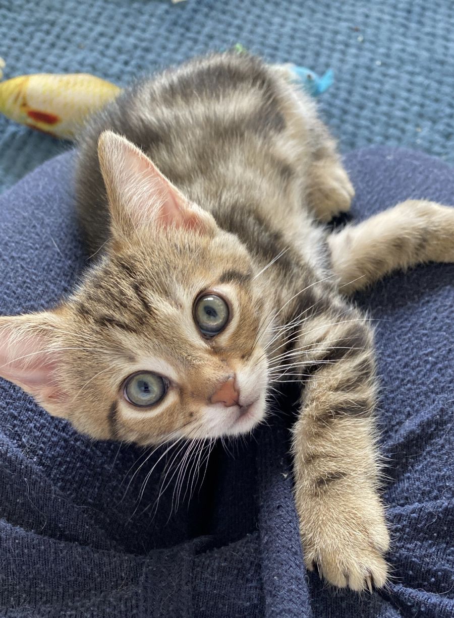 This lovely lady is a sweet and sensitive soul. Sundae can be a bit shy, but she has been making great progress in foster care and gains confidence every day in her foster home. Sundae is on track to become the perfect lap cat; she loves to have a good snooze with her people after dinner time. She is also partial to some toe nibbling so watch out! When comfortable with her surroundings, Sundae is curious and energetic and her favourite game to play is chasey with her siblings.