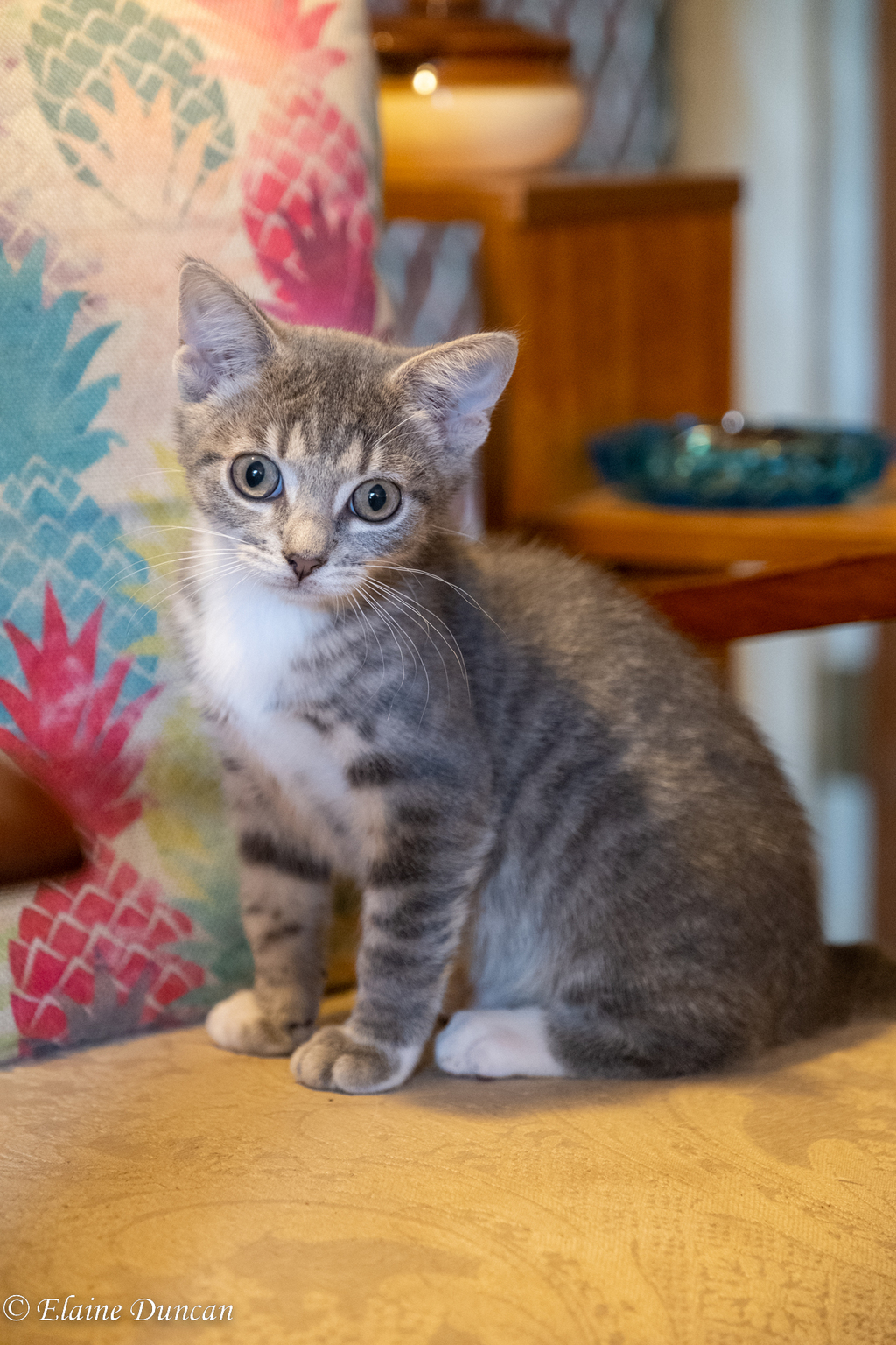 Jovie is a very pretty little girl with a lovely soft grey coat and cute little tummy spots. She is a queen and she knows it! It feels like Jovie is always watching and really taking the world in. She's curious about everything but observes anything new from a safe distance, letting her brothers launch in head first before she deems it safe, which sounds pretty sensible to us!