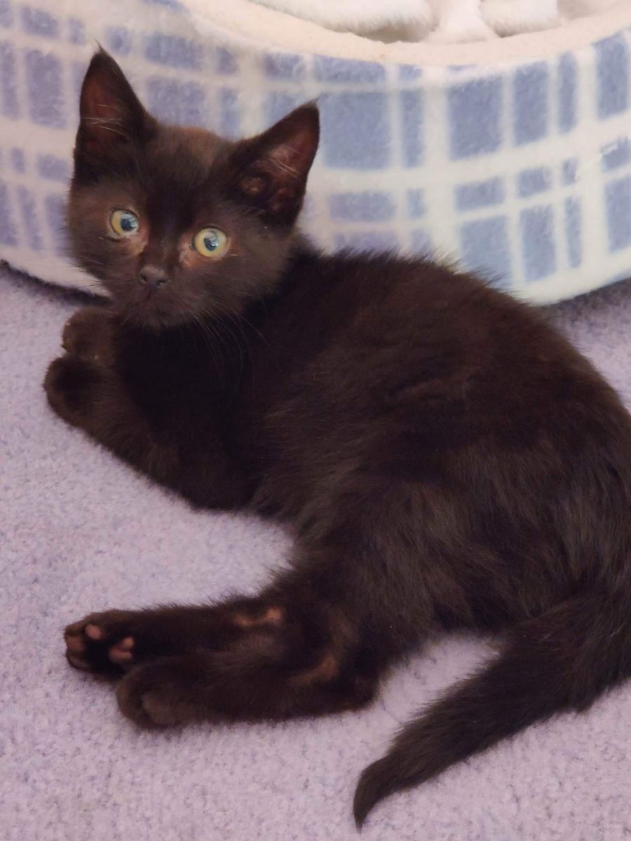 He is without a doubt the sweetest natured boy and although at first a little shy with strangers he quickly comes out to sit on a lap. He is mostly black but where his tail was injured the new fur is white! He isn't a fussy eater and gets on very well with his 4 foster friends. Despite this terrible start to life, he loves people which shows his lovely nature.