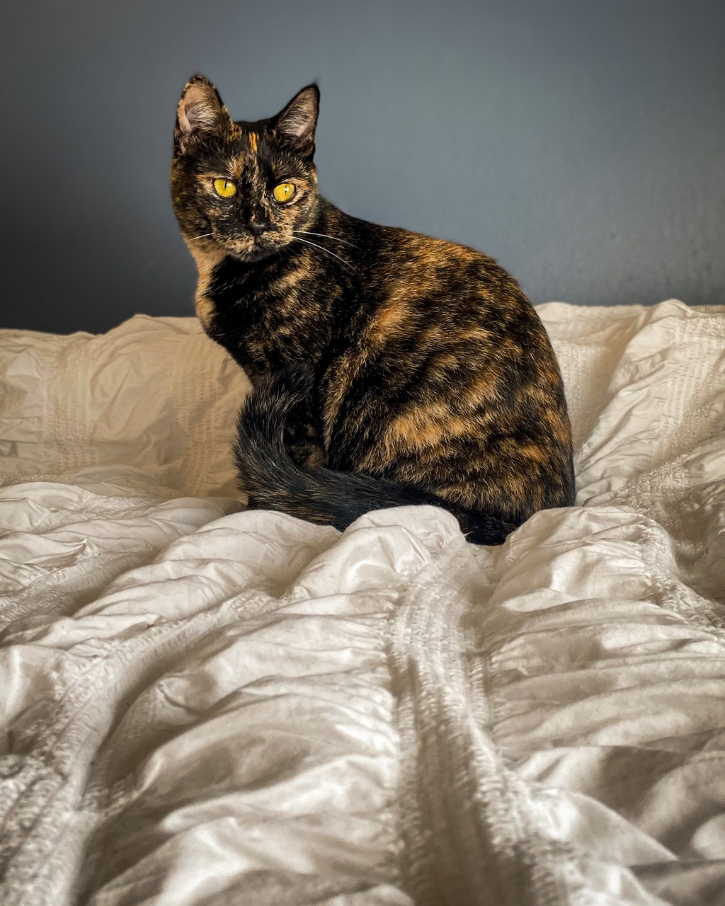 She is happy to be patted while she is eating or if you have a handful of treats but is still nervous when you just walk up to her and try and pat her. She happily plays around you and cuddles up on the end of the bed with you so with a little patience we are sure she will be coming up for cuddles on her own in no time.