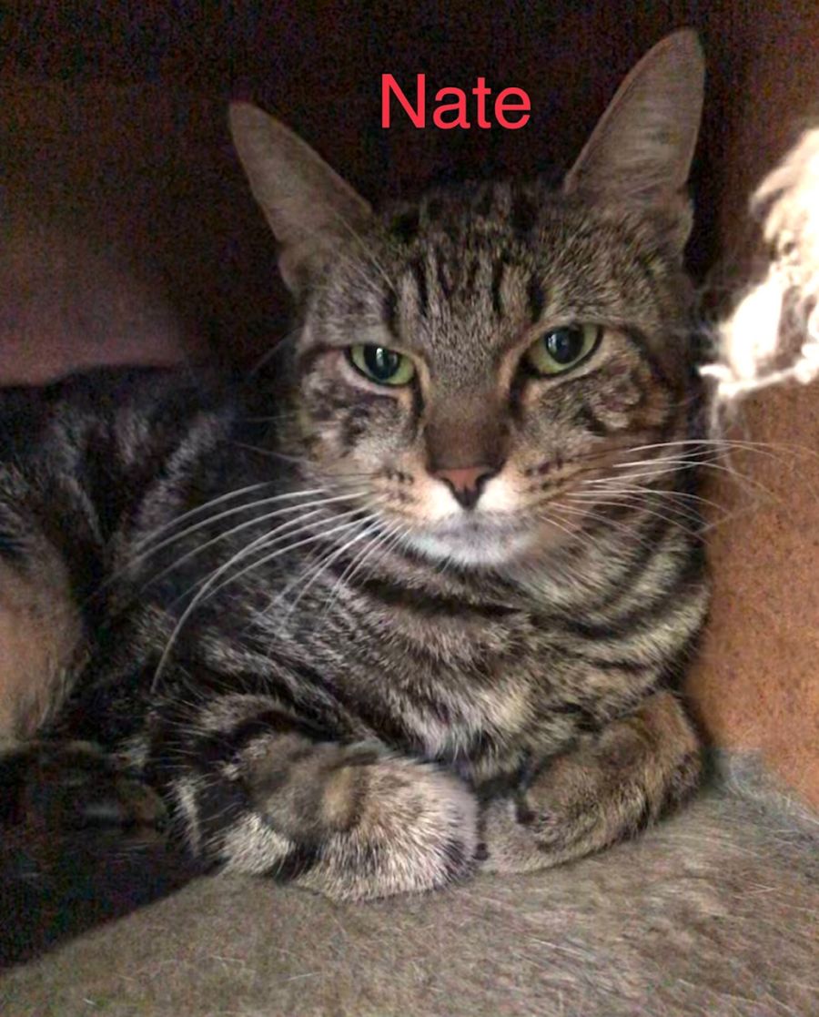 Meet Nate, a beautiful male tabby who was found by a real estate agent on an empty property. Nate is a timid and gentle cat who prefers to be independent, though he is not aggressive towards other cats. He's quite quiet and doesn't much like being picked up or handled, but does tolerate being groomed.
