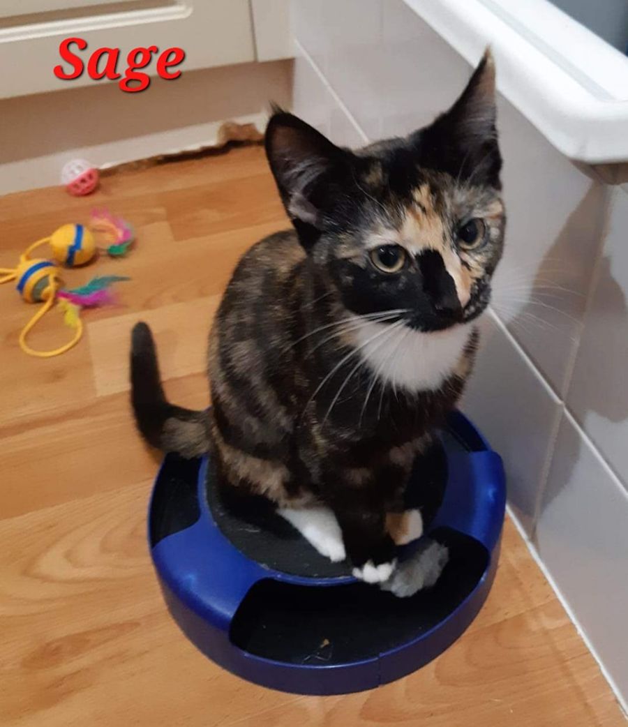 Sage is a beautiful black Torti girl who is now ready to find her forever home! She was a bit of a "Spicy" kitten when she first came into our care, but she has since grown into an affectionate and playful young cat.