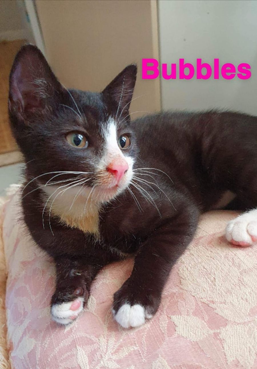 Bubbles is a cheeky little kitten who will look deeply into your eyes and touch your soul. She will climb on your lap for a cuddle but don't let her softness fool you, she will growl like a tiger if her food is threatened.