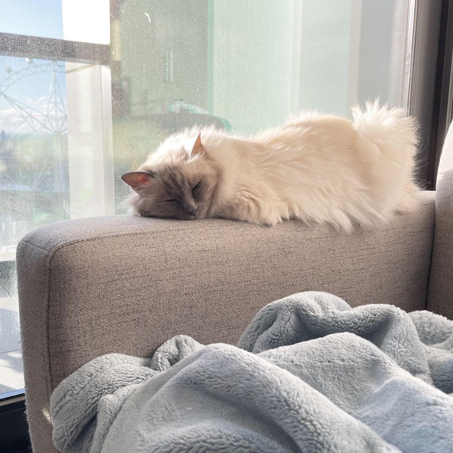 Berry is a stunning, healthy, affectionate cat, who is calm and loves her sleep. One of the cleanest cats you’ll ever meet, Berry loves a pat and brush to maintain her lovely coat. This gorgeous girl loves her daily dose of affection and attention, and will boop her head against you to ask for pats. Berry is deaf, so her meows can be loud as she sings her way to you for attention. She loves a soft carpet to roll in, and will often lie on her back with her little paws up in the air while relaxing.