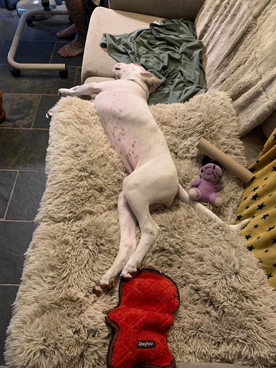 Wren enjoys a good game of tug of war, snoozing in the sun and eating.